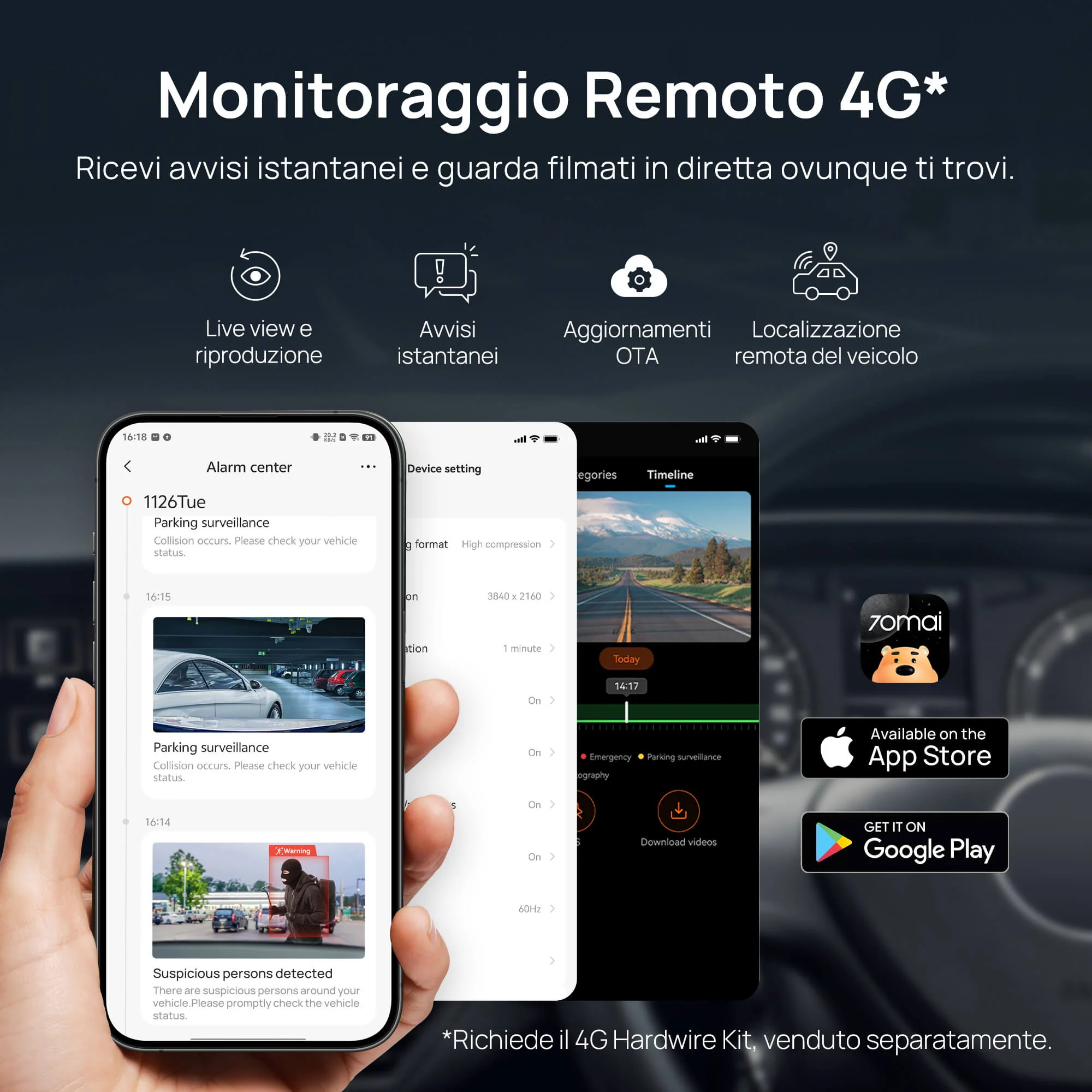 70mai Dash Cam 4K A810S con Sony STARVIS 2 IMX678, ottimizzazione delle targhe, registrazione di emergenza in buffer, supercondensatore e 4G LTE