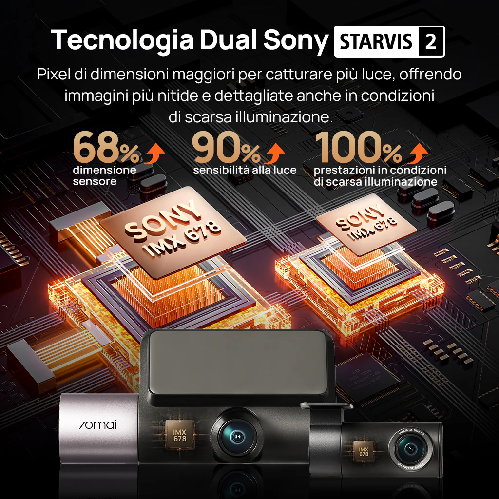 - 70mai Lumi Vision per il parcheggio: una tecnologia innovativa nel settore, progettata per garantire una visibilità nitida intorno al veicolo anche in condizioni di oscurità quasi totale.
