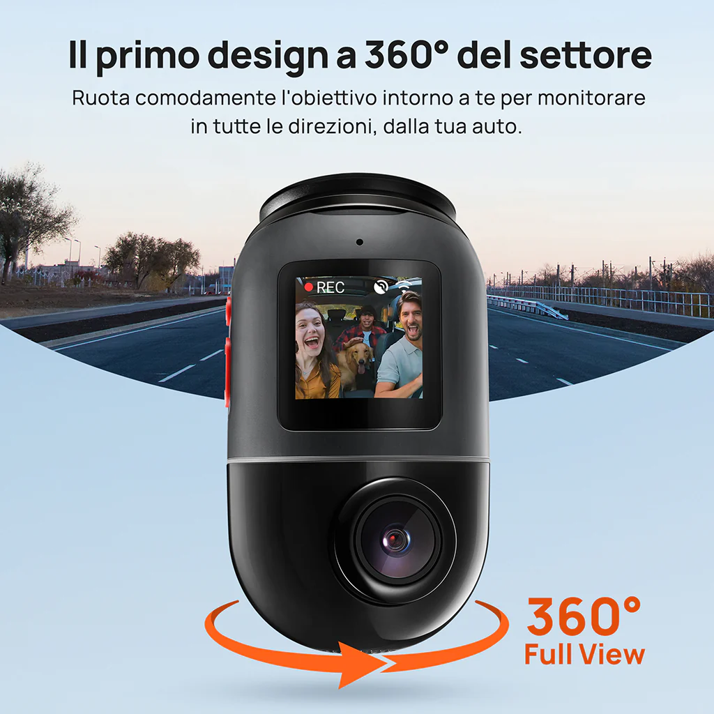- Il primo design a 360° del settore: Ruota comodamente l'obiettivo intorno a te per monitorare in tutte le direzioni, dalla tua auto.